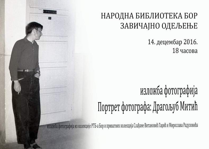 Povodom Dana bibliotekara u Narodnoj biblioteci u Boru, u sredu, 14. decembra u 18 h, biće otvorena izložba Portret fotografa Dragoljuba Mitića.