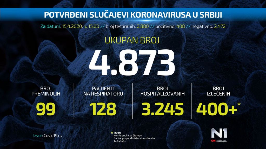Prema današnjim rezultatima testiranja, u zemlji je još 408 pozitivnih na virus.