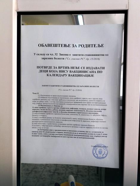 Iako od Gradskog zavoda za javno zdravlje svim domovima zdravlja redovno stižu dopisi da se mora raditi na povećanju procenta vakcinisane dece, neke ustanove nisu istakle ovakva obaveštenja, ali smo mi samoinicijativno odlučili da se ozbiljno pozabavimo ovim pitanjem. U obaveštenju smo naveli član, kako bi se roditelji na licu mesta uverili da to nije nešto što im nameću zdravstvene ustanove po sebi, već je to zakonska regulativa koja treba da se poštuje