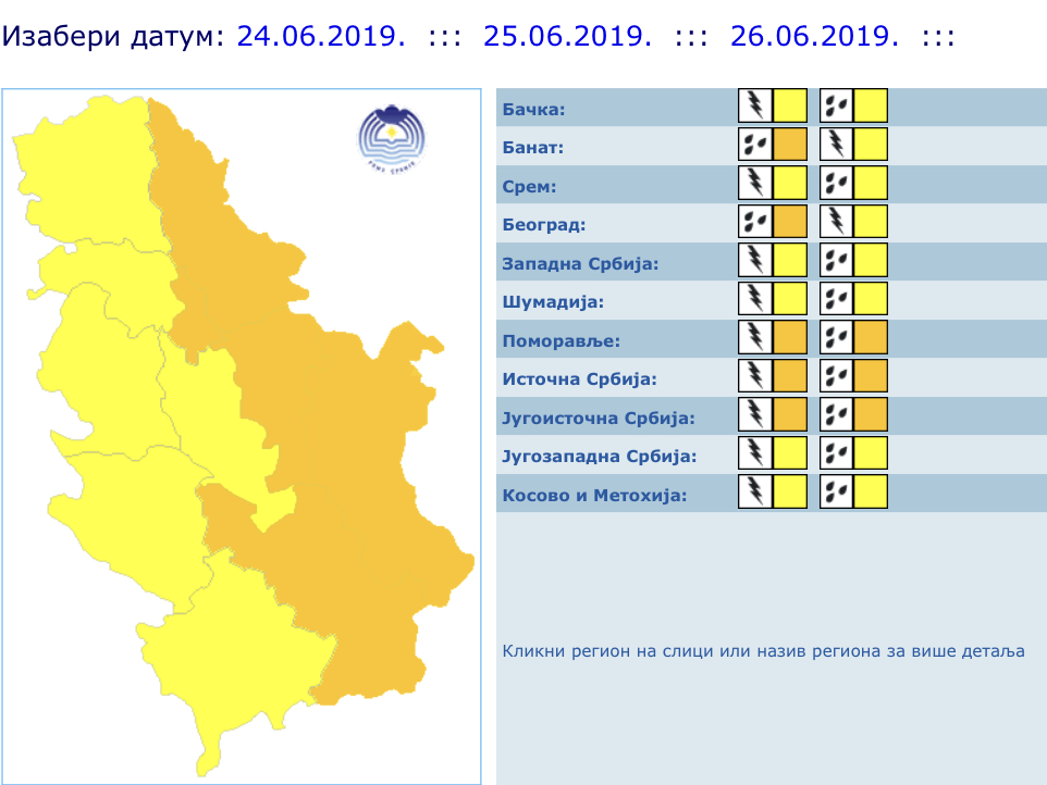 RHMZ upozorava na lokalnu pojavu jakih pljuskova sa gradom i olujnim vetrom do utorka, a prema prognozi, i danas će biti promenljivo oblačno i nestabilno, mestimično sa kišom i pljuskovima sa grmljavinom.