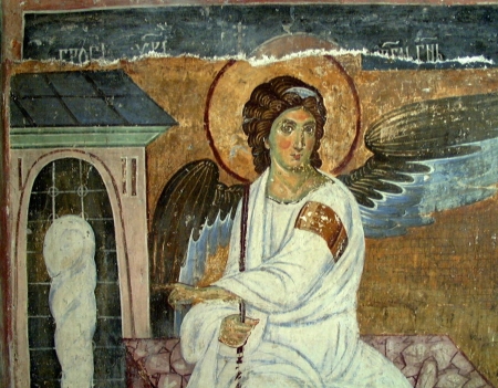 Scena sa arhangelom Gavrilom kako sedi na grobnom kamenu i pokazuje na prazan grob najčešće se slika na pravoslavnim predstavama događaja Vaskresenja.