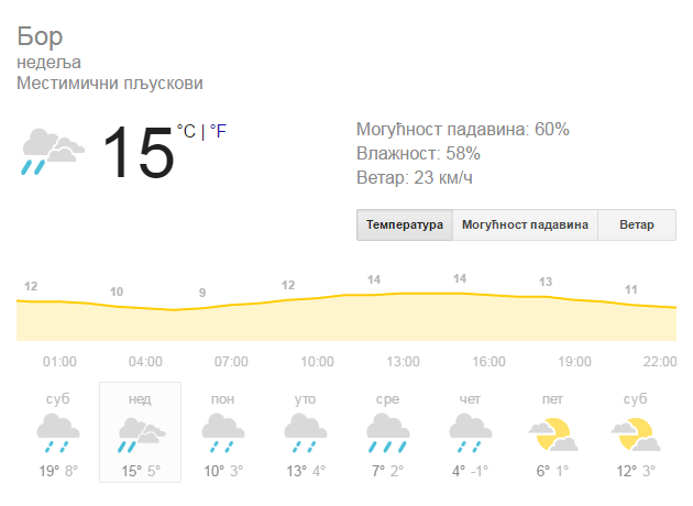 Posle podne u severnim, uveče i tokom noći i u centralnim krajevima očekuje se prestanak padavina i delimično razvedravanje. Vetar će biti umeren, povremeno i jak, severozapadni, Jutarnja temperatura od 7 do 11, najviša dnevna od 14 do 20 stepeni.