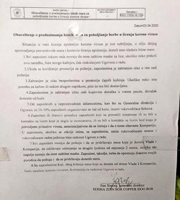 Menadžment kineske kompanije ZiJin, strateški partner RTB Bor, je doneo naredbu o otpuštanju svakog radnika iz borske kompanije za koga se utvrdi da je zaražen korona virusom